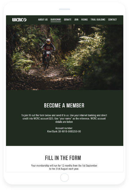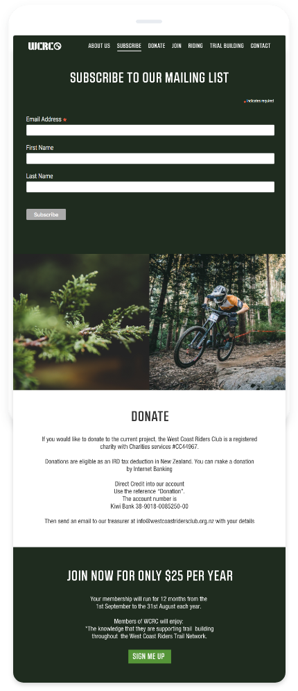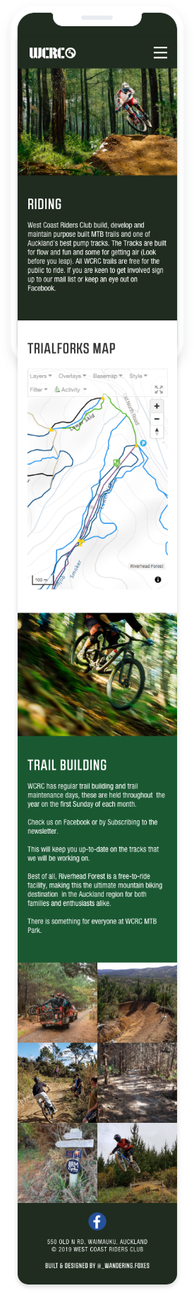 West Coast Riders Club is a registered charity dedicated to the creation and preservation of a mountain bike park located in Riverhead Forest, north west of Auckland. Being a non-profit organisation with very little budget, I have volunteered to create a responsive website for the team. The website provides mountain bike riders trail details, to become members, or even donate to the organisation.